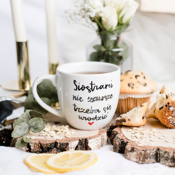 Nadzwyczajny, porcelanowy kubek z napisem - Siostrami nie zawsze trzeba się urodzić