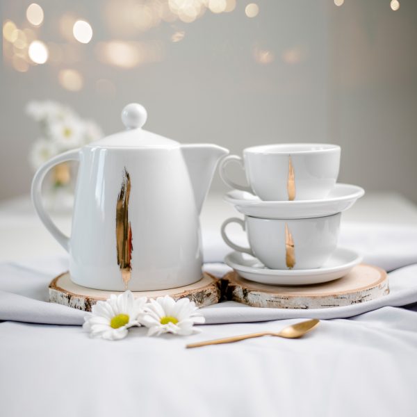 Nadzwyczajny, porcelanowy, ręcznie malowany Zestaw dzbanek + 2 filiżanki 250 ml - Złote zdobienie proste