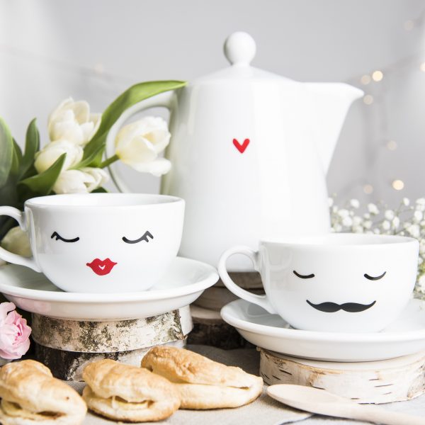 Zestaw - dzbanek serduszko + filiżanki usta i wąsy