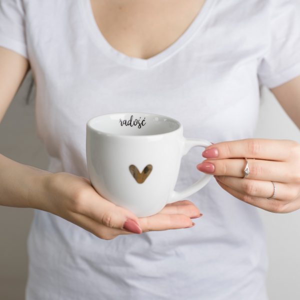 Nadzwyczajny, porcelanowy kubek z napisem - złote serduszko "Radość"