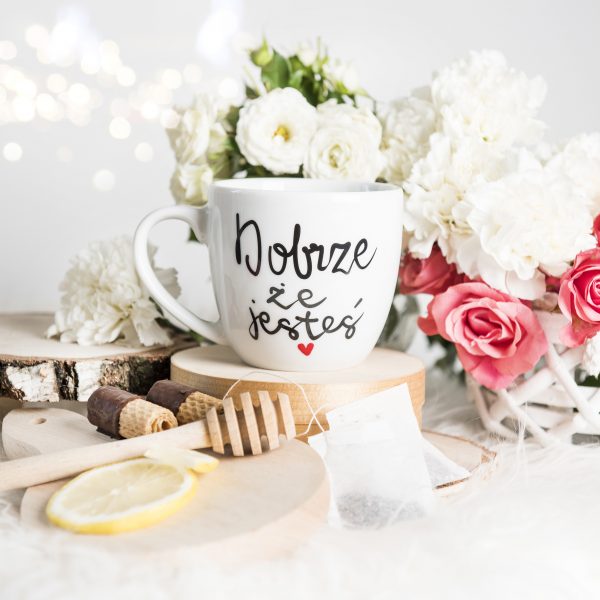 Nadzwyczajny, porcelanowy kubek z napisem - Dobrze, że jesteś