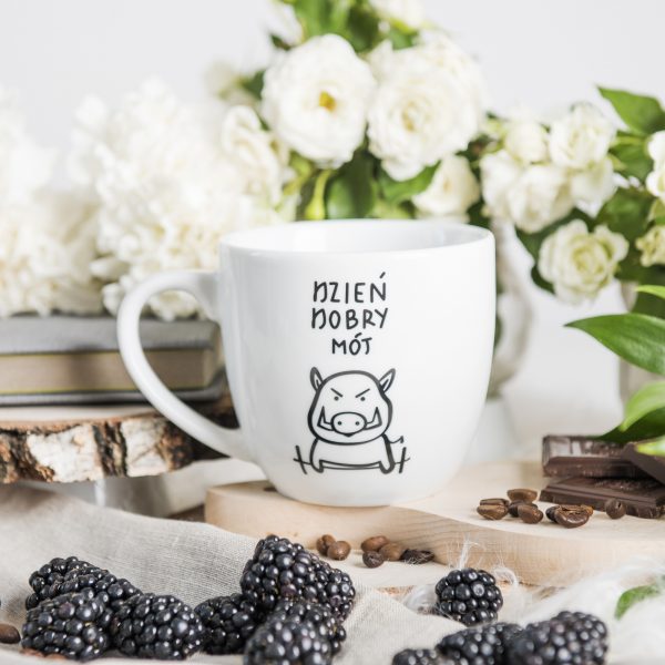 Nadzwyczajny, porcelanowy kubek z napisem - Dzień dobry mój DZIKU