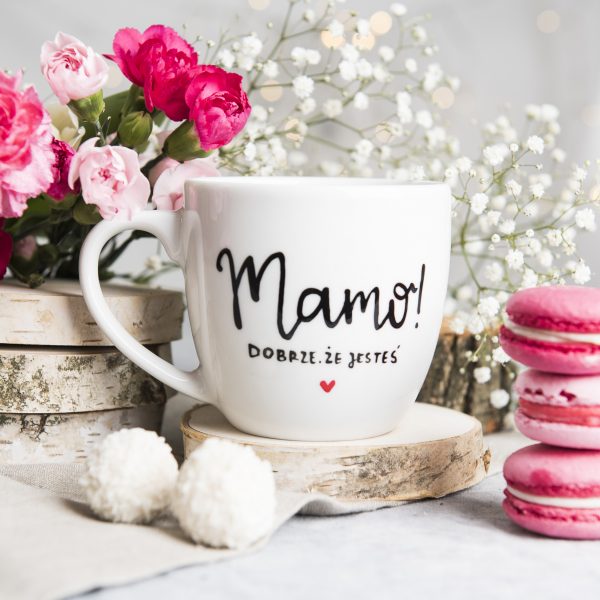 Nadzwyczajny, porcelanowy kubek z napisem - Mamo! dobrze, że jesteś