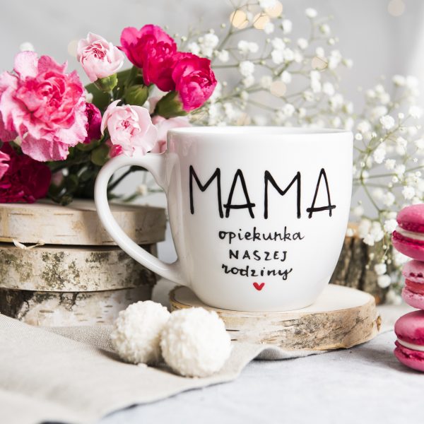 Nadzwyczajny, porcelanowy kubek z napisem - Mama opiekunka naszej rodziny