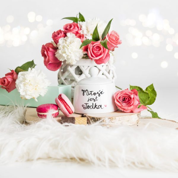 Nadzwyczajna, porcelanowa cukiernica  z napisem  - Miłość jest słodka