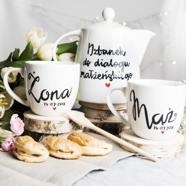 Nadzwyczajny, porcelanowy zestaw ślubny - Zestaw: Dzbanek do dialogu małżeńskiego + Kubki Mąż/Żona z datą