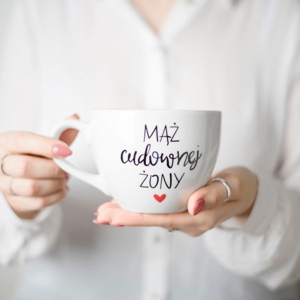 Nadzwyczajny, porcelanowy kubek z napisem - Mąż cudownej Żony