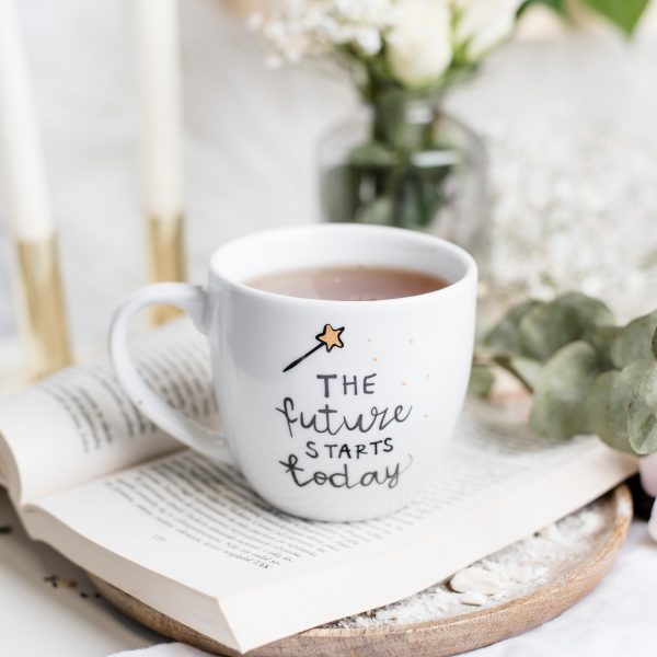 Nadzwyczajny, porcelanowy kubek z napisem - The future starts today