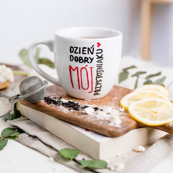 Nadzwyczajny, porcelanowy kubek z napisem -  Dzień dobry, mój przystojniaku