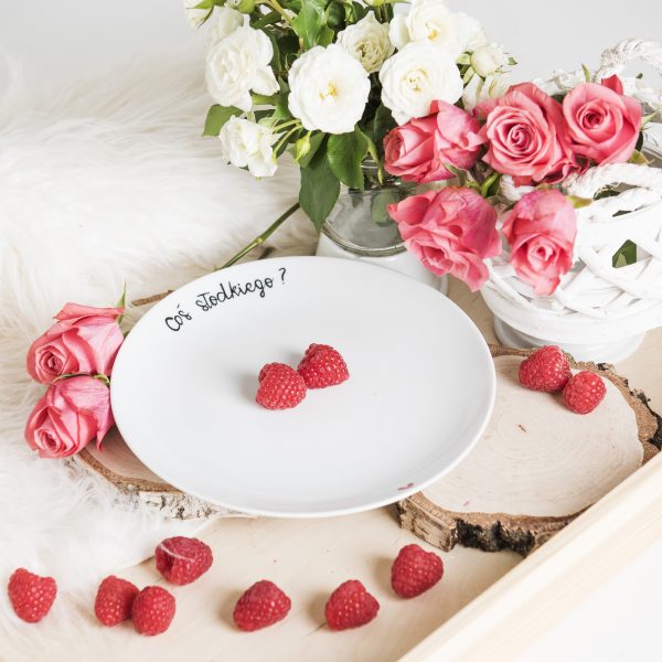 Nadzwyczajny, porcelanowy talerz z napisem - Coś słodkiego