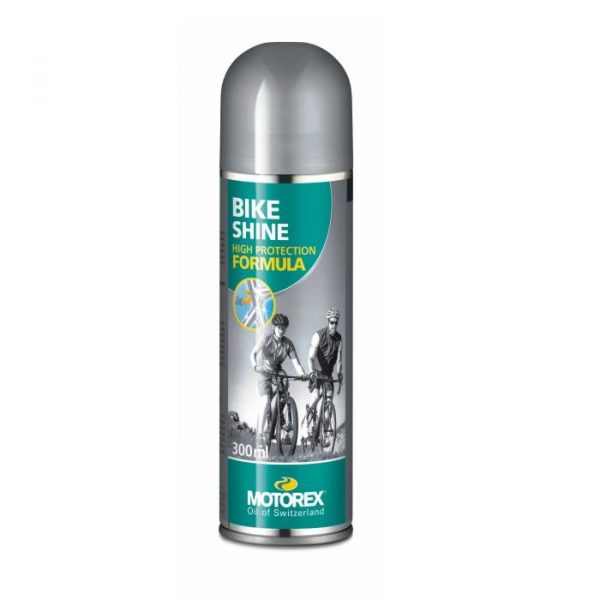 MOTOREX BIKE SHINEŚrodek pielęgnujący i zabezpieczający. Odświeża kolory i nadaje powierzchniom wysoki połysk. Do stosowania na wszystkie rodzaje ram rowerowych. BIKE SHINE zabezpiecza, konserwuje oraz wypiera wodę (efekt kropli). Jest antystatycznym preparatem zabezpieczającym przed kurzem i pyłem. Idealny do konserwacji roweru po sezonie. Idealny do stosowania po myciu.Aplikacja: Rozpyl BIKE SHIN na zabezpieczane powierchnie. Poleruj miękką szmatką do uzyskania efektu. Nie rozpylaj na hamulce.