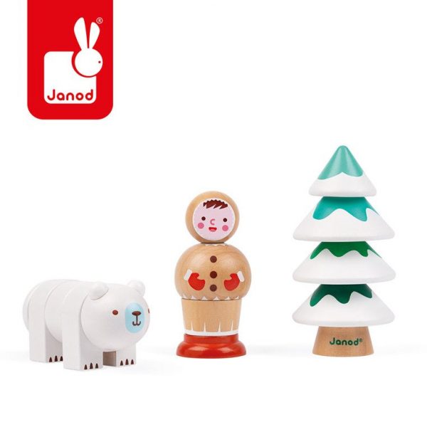 Układanka drewniana piramida Uczę się używać wkrętów francuskiej marki JANOD to doskonały wstęp do nauki majsterkowania.Na 3 drążki-gwinty należy kolejno nakręcać odpowiednie klocki tak, by utworzyć białego niedźwiedzia (4 elementy do wkręcenia), ośnieżoną choinkę (4 elementy) i Eskimosa (3 elementy). Klocki mają takie same otwory, ale różny jest kierunek ich wkręcania na gwint: w poziomie, w pionie od góry do dołu i w pionie od dołu do góry.Zabawka rozwija u dziecka wiele kluczowych umiejętności, m.in. rozróżniania kierunków, dopasowywania do siebie nietypowych kształtów, koncentracji i spostrzegawczości oraz sprawność motoryczną.