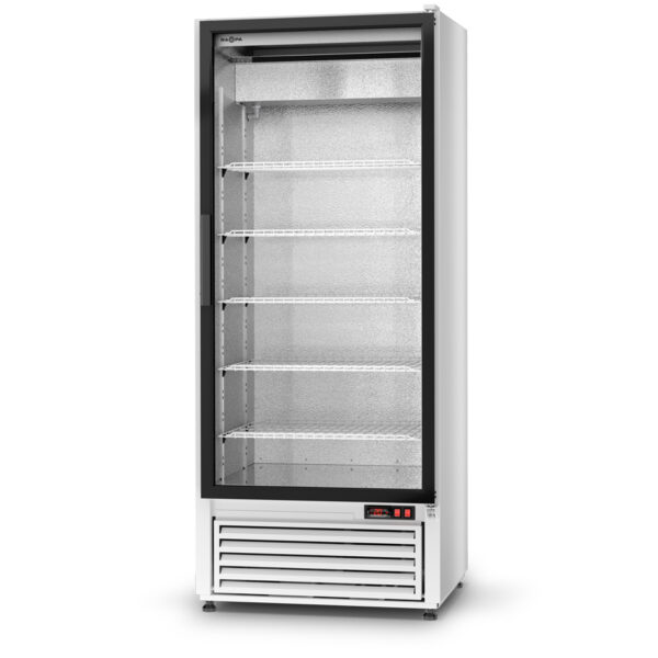szafa chłodnicza z drzwiami przeszklonymi malowana proszkowo przeznaczona jest do przechowywania artykułów spożywczych w obniżonej temperaturze. Wykończenie wnętrza wykonane jest z blachy aluminiowej a dno z blachy nierdzewnej. Szafa posiada w komorze pięć półek. Szafa z wymuszonym obiegiem powietrza (z wentylatorem) oraz elektronicznym termostatem z wyświetlaczem temperatury. Chłodzenie zapewnia energooszczędny hermetyczny układ chłodniczy. Jednym z jego elementów jest skraplacz, który należy utrzymywać w należytej czystości. Dostęp do skraplaczy w szafach znajduje się za otwieraną kratką maskującą. Odszranianie następuje automatycznie. Szafa wyposażona w oświetlenie pionowe.