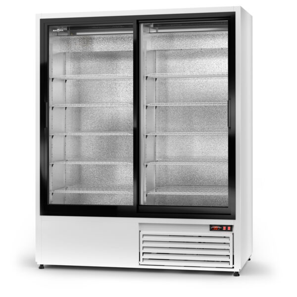 szafa chłodnicza z drzwiami suwanymi przeszklonymi malowana proszkowo przeznaczona jest do przechowywania artykułów spożywczych w obniżonej temperaturze. Wykończenie wnętrza wykonane jest z blachy aluminiowej a dno z blachy nierdzewnej. Szafa posiada wewnętrzną przegrodę tworzącą dwie komory połączone wspólnym układem chłodzenia. Każda komora wyposażona jest w pięć półek ale w zależności od potrzeb istnieje możliwość zamocowania większej ilości. Szafa z wymuszonym obiegiem powietrza (z wentylatorem) oraz elektronicznym termostatem z wyświetlaczem temperatury. Chłodzenie zapewnia energooszczędny hermetyczny układ chłodniczy. Jednym z jego elementów jest skraplacz, który należy utrzymywać w należytej czystości. Dostęp do skraplaczy w szafach znajduje się za otwieraną kratką maskującą. Odszranianie następuje automatycznie. Szafa wyposażona w oświetlenie pionowe.