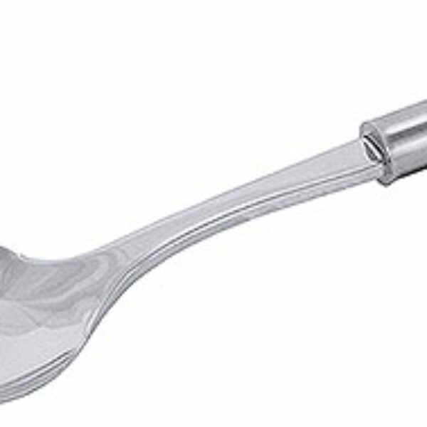 • Łyżka do serwowania o wymiarach 100 x 75 mm z polerowanej stali nierdzewnej z satynowym uchwytem i z uszkiem do zawieszenia