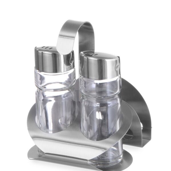 Komplet 3-częściowy sól, pieprz i serwetnik. Wykonany ze stali nierdzewnej. Satynowany, można myć w zmywarkach.