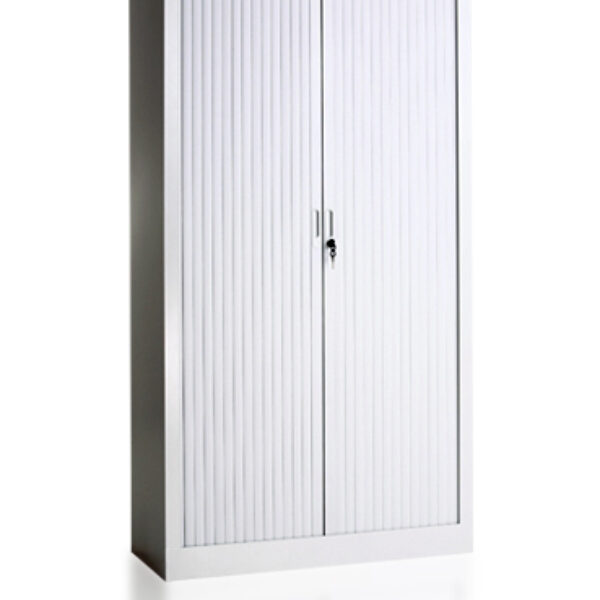 SZAFA BIUROWA wyposażona w system drzwi żaluzjowych znajduje szerokie zastosowanie w niewielkich pomieszczeniach, gdzie nie ma miejsca na otwieranie drzwi skrzydłowych. Drzwi wykonane są z tworzywa sztucznego. Szafa wyposażona jest w cztery półki przestawne co 90 mm. Wykonana z blachy czarnej o grubości 0,8 1,0 mm, malowana farbami proszkowymi (epoksydowo poliestrowymi) w kolorze RAL 7035. Zamykana zamkiem krzywkowym. Udźwig półki: 50 kg.