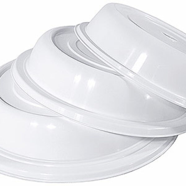 Pokrywa na talerze z białego polipropylenu. Mocna konstrukcja, odporna na temperaturę od -20 do +120 stopni Celsjusza. Można sztaplować co ułatwia przechowywanie, można używać w kuchenkach mikrofalowych i myć w zmywarkach. Podlega recyklingowi.