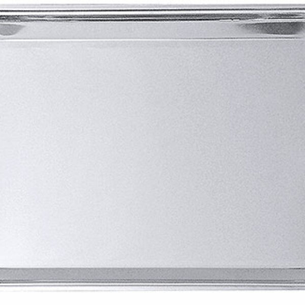 Taca ekspozycyjna wykonana z polerowanej stali nierdzewnej o wywiniętym rancie.
