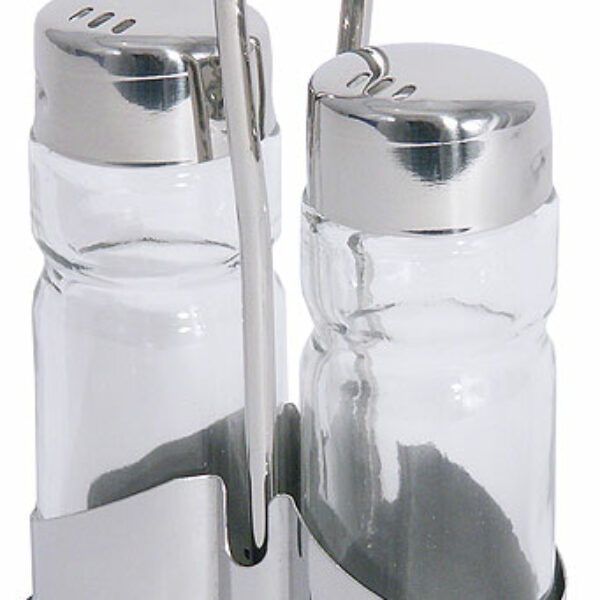 Przyprawnik wykonany z polerowanej stali nierdzewnej na czarnej, plastikowej podstawie. Solniczka i pieprzniczka wykonana ze szkła z nasadkami ze stali nierdzewnej 18/10.