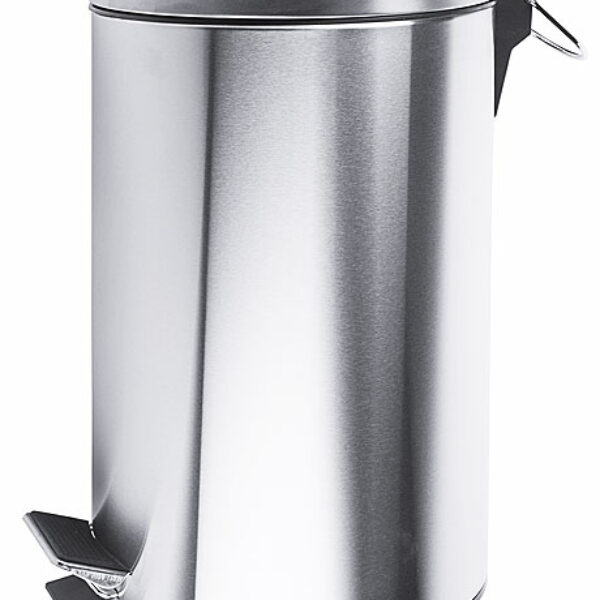 Kosz na śmieci z pokrywą na zawiasie wykonany z polerowanej stali nierdzewnej z czarnym, plastikowym wkładem.