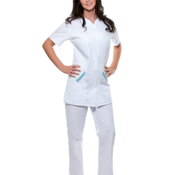 Kitel medyczny z krótkim rękawem wykonany z 65% PES oraz 35% bawełny. Wysokogatunkowa tkanina. Posiada dwie kieszenie z kolorową wstawką oraz zapięcie na pięć guzików. Długość z tyłu dla rozmiaru 38: 82 cm. Można prać w pralce automatycznej w maksymalnej temperaturze 95 stopni Celsjusza, suszyć w suszarce automatycznej w programie „delikatne” i prasować w temperaturze 150 stopni Celsjusza. Nie wybielać. Można poddać profesjonalnemu czyszczeniu chemicznemu.