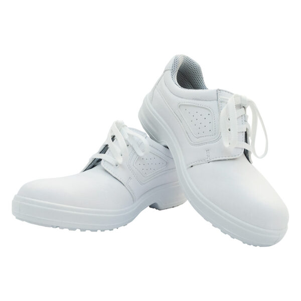 Uniwersalne obuwie z antybakteryjną wkładką. Antystatyczne, olejoodporne, posiada amortyzowaną piętę. Wykonane z „oddychającego” materiału, można prać w pralce automatycznej w temperaturze do 40 stopni Celsjusza. Antypoślizgowe. Wzmacniany materiał na palcach pozwala wytrzymać ucisk 200 dżuli. Kolor biały, wiązanie na sznurówki.