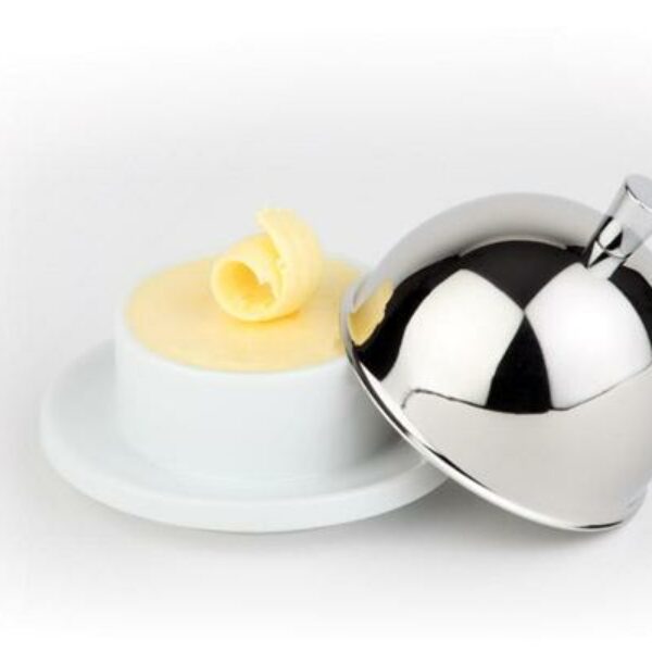 Porcelanowa maselniczka z kloszem ze stali nierdzewnej. Można myć w zmywarkach.