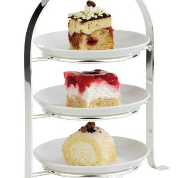 Stand wykonany ze stali chromowanej na trzy okrągłe talerze o maksymalnej średnicy 170 mm. Średnica obręczy podtrzymującej naczynie wynosi 110 mm. Talerze sprzedawane oddzielnie.