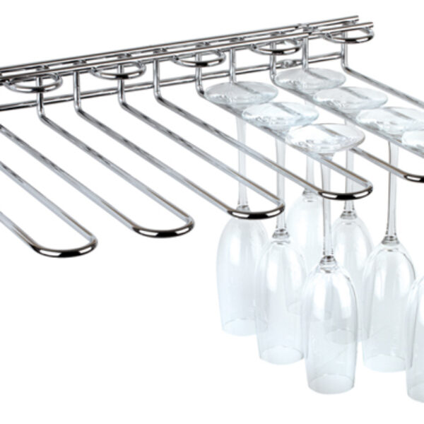 Stelaż do kieliszków wykonany ze stali chromowanej o grubości pręta 6 mm. Może być montowany pod półką lub na ścianie. Przeznaczony na około 20 kieliszków.