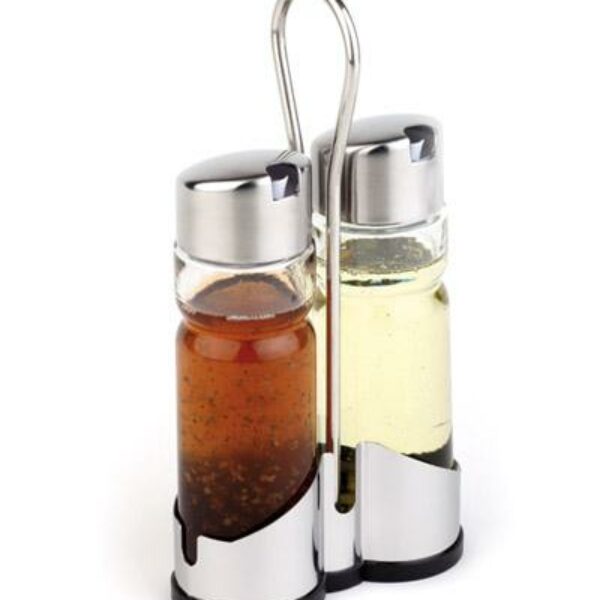 Zestaw do przypraw wykonany ze stali nierdzewnej, z czarną plastikową podstawą. Szklane pojemniki na oliwę i ocet z pokrywą ze stali nierdzewnej. Można myć w zmywarkach.