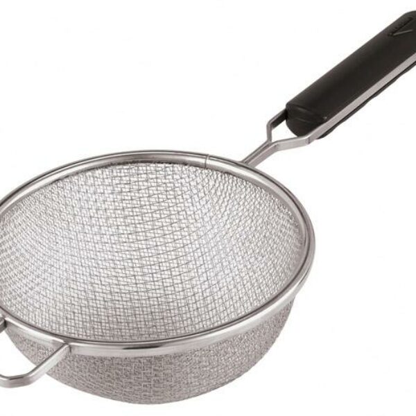 Wysokiej jakości sito z podwójną siatką, wykonane ze stali nierdzewnej 18/10. Siatka zewnętrzna o gęstości 2 otworów na 10 mm², wewnętrzna – 5 otworów na 10 mm². Uchwyt o długości 180 mm z czarnego tworzywa. Sito można myć w zmywarkach.