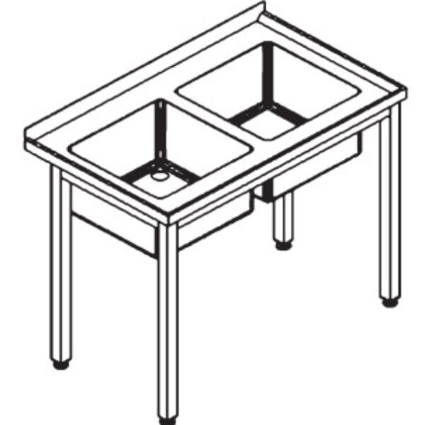 Znakomitej jakości stół przyścienny z dwoma zlewami wykonany ze stali nierdzewnej.