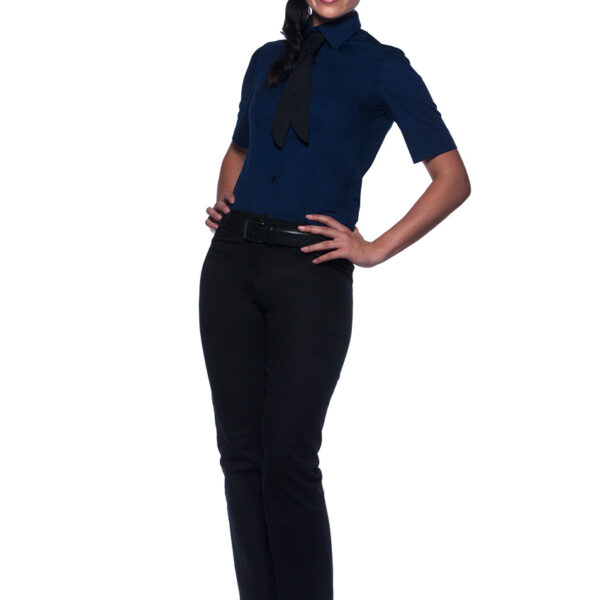 Bluzka damska o kroju dopasowanym do figury, taliowana, z tyłu podłużny szew. Krótkie rękawy oraz kołnierzyk Windsor. Guziki w kolorze bluzki. Wysoka jakość szwów, wzmacniane na ramionach i plecach. Dzięki elastyczności materiału bluzka jest bardzo wygodna w noszeniu (Dow XLA spandex). Wykonana z 49% PES, 49% bawełna, 2% elastolefina, 125 g/m2. Można prać w pralce automatycznej w maksymalnej temperaturze 95 stopni Celsjusza, można wybielać. Prasować w temperaturze do 150 stopni Celsjusza. Można suszyć w suszarkach automatycznych w programie „delikatnie” oraz poddać profesjonalnemu czyszczeniu chemicznemu.