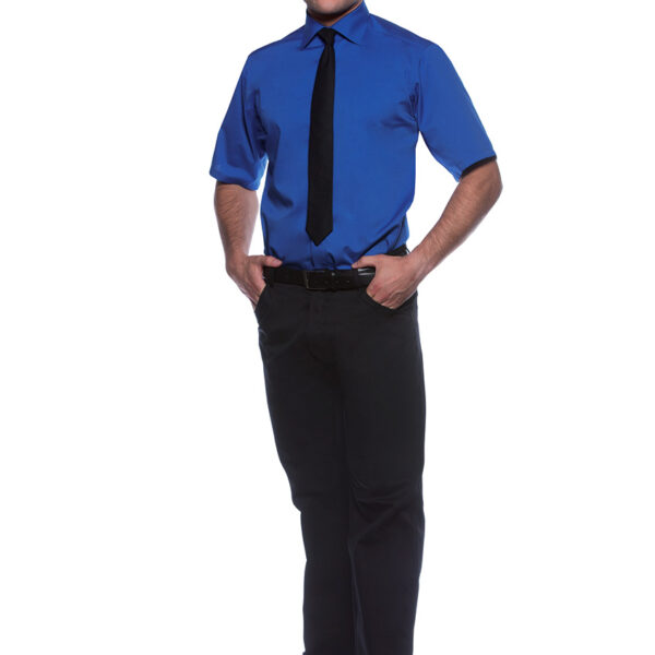 Koszula męska o kroju regular fit. Krótkie rękawy oraz kołnierzyk Windsor. Guziki w kolorze koszuli. Wysoka jakość szwów, wzmacniane na ramionach i plecach. Dzięki elastyczności materiału koszula jest bardzo wygodna w noszeniu (Dow XLA spandex). Wykonana z 49% PES, 49% bawełna, 2% elastolefina, 125 g/m2. Można prać w pralce automatycznej w maksymalnej temperaturze 95 stopni Celsjusza, można wybielać. Prasować w temperaturze do 150 stopni Celsjusza. Można suszyć w suszarkach automatycznych w programie „delikatnie” oraz poddać profesjonalnemu czyszczeniu chemicznemu.
