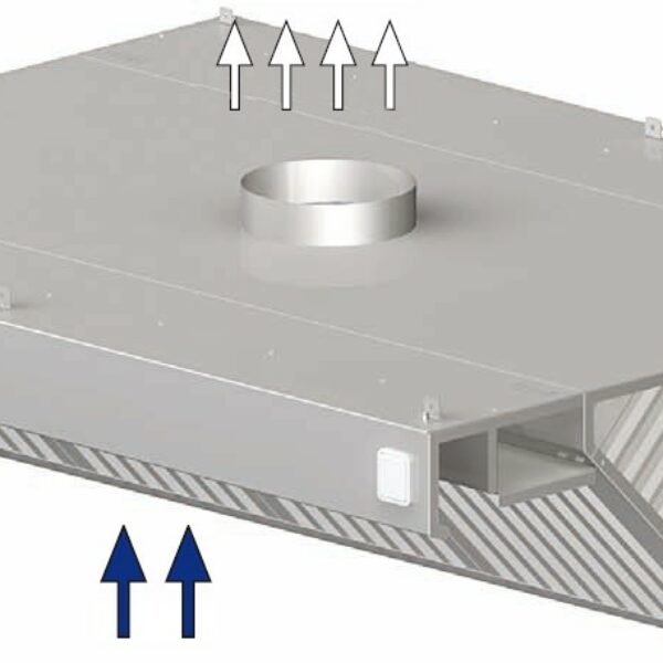 Okap centralny skośny 3600x2400x450 mm wykonany z wysokiej jakości stali nierdzewnej. Rynienka ociekowa z zaworem spustowym. Przy szerokości powyżej 2900 mm okap dzielony na segmenty. Przy składaniu zamówienia należy podać średnicę, ilość oraz rozmieszczenie króćców przyłączeniowych. Dostępne króćce przeznaczone do montażu rur o średnicy: 100, 150, 160, 200, 250, 300, 315 mm. Labiryntowe łapacze tłuszczu oraz oświetlenie halogenowe dopłata. Zasilanie 230 V. Okap dostarczany bez zawiesi.