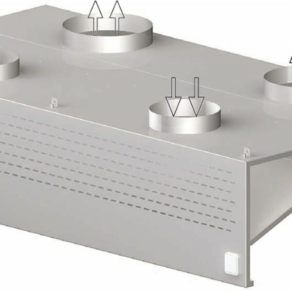 Okap przyścienny kompensacyjny 4600x1300x450 mm wykonany z wysokiej jakości stali nierdzewnej. Rynienka ociekowa z zaworem spustowym. Przy szerokości powyżej 2900 mm okap dzielony na segmenty. Przy składaniu zamówienia należy podać średnicę, ilość oraz rozmieszczenie króćców przyłączeniowych. Dostępne króćce przeznaczone do montażu rur o średnicy: 100, 150, 160, 200, 250, 300, 315 mm. Labiryntowe łapacze tłuszczu oraz oświetlenie halogenowe dopłata. Zasilanie 230 V.