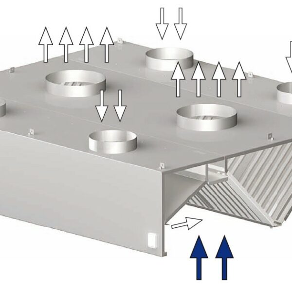 Okap centralny indukcyjny 4700x2000x450 mm wykonany z wysokiej jakości stali nierdzewnej. Rynienka ociekowa z zaworem spustowym. Przy szerokości powyżej 2900 mm okap dzielony na segmenty. Przy składaniu zamówienia należy podać średnicę, ilość oraz rozmieszczenie króćców przyłączeniowych. Dostępne króćce przeznaczone do montażu rur o średnicy: 100, 150, 160, 200, 250, 300, 315 mm. Labiryntowe łapacze tłuszczu oraz oświetlenie halogenowe dopłata. Zasilanie 230 V. Okap dostarczany bez zawiesi.