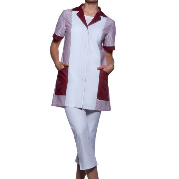 Tunika medyczna z krótkim rękawem wykonana z wysokiej jakości sanforyzowanej tkaniny - 65% PES, 35% bawełny. Materiał w paski - 180 g/m², materiał jednokolorowy - 215 g/m². Tunika posiada 2 kieszenie. Można prać w pralce automatycznej w maksymalnej temperaturze 60 stopni Celsjusza.