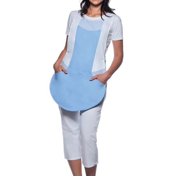 Tunika medyczna z 65% PES, 35% bawełny, 180 g/m² (część w paski), 215 g/m² (część w jednolitym kolorze). Wysokiej jakości tkanina. Posiada jedną dużą kieszeń z dwoma otworami po bokach. Można prać w pralce automatycznej w maksymalnej temperaturze 60 stopni Celsjusza i chlorować. Suszyć w suszarce automatycznej w programie „delikatne” i prasować w temperaturze 150 stopni Celsjusza. Można poddać profesjonalnemu czyszczeniu chemicznemu. Nie wybielać.