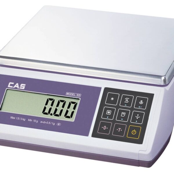 Wagi z serii CAS ED do współpracy z kasą fiskalną lub komputerem (protokół AP-1), są dwudziałkowe co gwarantuje większą dokładność ważenia towarów o małej masie, dzięki automatycznej zmianie działki pomiarowej zależnie od obciążenia szalki. Układy elektroniczne wagi, dzięki zastosowaniu technologii One Chip Module, zapewniają wysoką stabilność pomiarów i wydłużony czas pracy przy zasilaniu z akumulatora. Zasilanie akumulatorowe (6V, 3,6Ah) zapewnia możliwość użytkowania wagi w dowolnym miejscu, niezależnie od warunków dostępu do sieci zasilającej.Duża szalka o wymiarach 306 x 222 mm, czytelny, sześciocyfrowy, podświetlany wyświetlacz LCD, wygodna klawiatura uszczelniona silikonową nakładką zapewnia ergonomię, łatwość obsługi oraz odporność na warunki użytkowania. Dzięki wyposażeniu w wiele funkcji dodatkowych, wagi CAS ED można stosować do ważenia, liczenia oraz konfekcjonowania detali, podczas wykonywania inwentaryzacji w magazynach, sprawdzania czy masa ważonego przedmiotu zawiera się w założonym przedziale (np. podczas kontroli wielkości porcji w gastronomii i przemyśle spożywczym), a także do pomiaru odchyłki procentowej masy ważonego przedmiotu względem masy wzorcowej.Parametry wagi ED 3 pozwalają na wykorzystywanie jej jako wagi aptecznej.