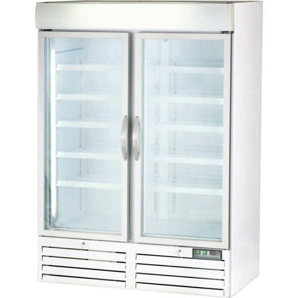 Szafa chłodnicza:• Podświetlany górny panel reklamowy• Oświetlenie komory• Szafa posiada wymuszony obieg powietrza• Automatyczne odszranianie /rozmrażanie• Obudowa urządzenia malowana proszkowo (biała)• Elektroniczny sterownik temperatury z wyświetlaczem• Wbudowany zamek na klucz• 8 półek w komplecie• Wymiary półek: 460x610 mm