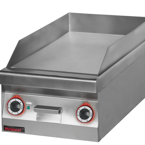 • Płyta grillowa jest zdecydowanie większa od tradycyjnych patelni, służy do przygotowywania drobiu, mięsa warzyw i ryb• Temperatura płyty sterowana jest termostatem w zakresie od 50°C do 275°C• Płyta zrobiona ze stali chromowanej, polerowanej na lustro przez co idealnie sprawdza się podczas obróbki termicznej potraw jak i ułatwia utrzymanie patelni w czystości• Powierzchnia gładka• Duża pochylona powierzchnia płyty grzewczej• Pod płytą umieszczony jest zbiornik na tłuszcz, przez co jego odprowadzenie jest bardzo łatwe• Spirala grzejna wewnątrz modułu grzewczego jest gęsto rozmieszczona na obrzeżach, a nie w centrum modułu, dzięki czemu uzyskuje się jednakową temperaturę na całej powierzchni grzewczej• Konstrukcja zapobiegająca zaciekanie wykipin do wnętrza wyrobu• Ergonomiczne i duże pokrętła dla łatwej regulacji wielkości płomienia z pierścieniami uszczelniającymi (zabezpieczenie antybryzgowe), zwiększające higienę