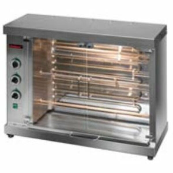 • Elektryczny rożen do kurczaków typu bębnowego jest urządzeniem o kompaktowych wymiarach• Ilość widelców: 3• Jednorazowo można w nim przygotować 12 kurczaków• Rożno posiada oświetloną komorę, dzięki czemu kurczaki są efektownie wyeksponowanie• Opiekacz jest starannie wykonany z wykorzystaniem komponentów wysokiej trwałości• Sprzęt przeznaczony dla małej gastronomii oraz dla przyczep gastronomicznych• Szyba hartowana o wysokiej wytrzymałości• Sygnalizacja gotowości do pracy• Ergonomiczne pokrętła• Regulacja mocy na każdym poziomie w zakresie: I - 0,6 kW, II - 1,2 kW, III- 2,4 kW• Płynna regulacja temperatury w zakresie 50 do 250°C