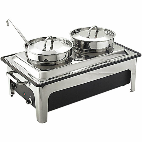 Podgrzewacz elektryczny:• Wanna z tworzywa odpornego na wysokie temperatury• Pozostałe elementy wykonane są ze stali nierdzewnej• W komplecie: 2 kociołki, 2 pokrywy, 2 łyżki• Grzałka z termostatem• Używać wody o twardości do 6°dH w skali niemieckiej, twardsza woda powoduje osadzanie kamienia w grzałkach co może spowodować uszkodzenie i utratę gwarancji