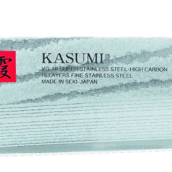 Nóż japoński wykonany ze stali damasceńskiej. Fenomenalna staranność przy wytwarzaniu ostrza sprawia, że cięcie warzyw, pieczywa, mięsa staję się czystą przyjemnością. Kasumi to 33 warstwy stali damasceńskiej powstałe na skutek skuwania poszczególnych płatów materiału. Rdzeń ostrza wykonano z bardzo twardej stali VG-10 GOLD ( z domieszką kobaltu, manganu, molibdenu i wanadu). Otaczany jest z każdej strony szesnastoma warstwami elastycznej stali. Twardość rdzenia noży Kasumi to 59-61 HRC. Rękojeść jest wykonana z mocnego drewna pakka, zaimpregnowanego utwardzalnymi żywicami. Każdy nóż ma jedyny w swoim rodzaju i niepowtarzalny "rysunek na klindze". Nóż wykuwany i ostrzony tylko z jednej strony - tylko dla osób praworęcznych.
