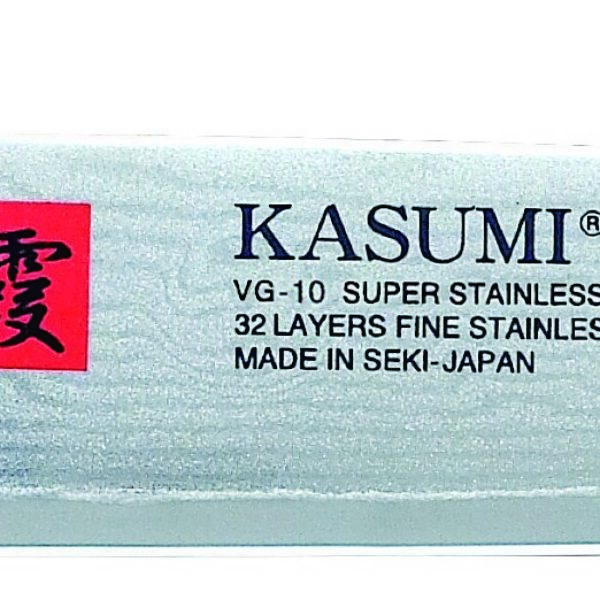 Nóż japoński wykonany ze stali damasceńskiej. Fenomenalna staranność przy wytwarzaniu ostrza sprawia, że cięcie warzyw, pieczywa, mięsa staję się czystą przyjemnością. Kasumi to 33 warstwy stali damasceńskiej powstałe na skutek skuwania poszczególnych płatów materiału. Rdzeń ostrza wykonano z bardzo twardej stali VG-10 GOLD ( z domieszką kobaltu, manganu, molibdenu i wanadu). Otaczany jest z każdej strony szesnastoma warstwami elastycznej stali. Twardość rdzenia noży Kasumi to 59-61 HRC. Rękojeść jest wykonana z mocnego drewna pakka, zaimpregnowanego utwardzalnymi żywicami. Każdy nóż ma jedyny w swoim rodzaju i niepowtarzalny "rysunek na klindze".