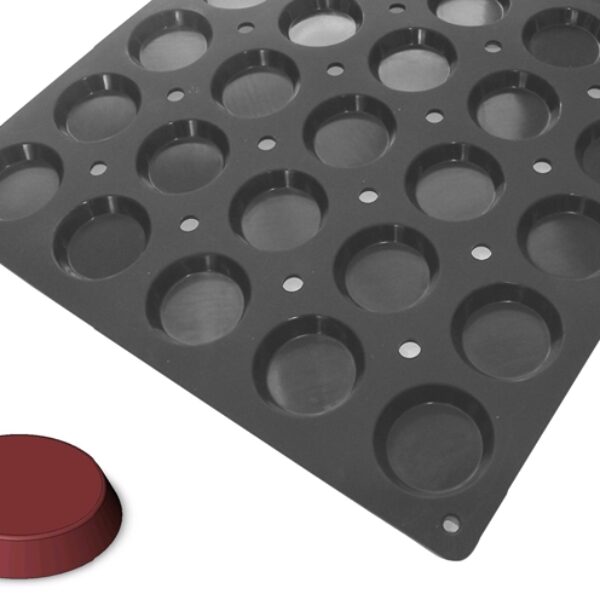 Mata wykonana z silikonu platynowego. Zakres temperatur: od 40 stopni Celsjusza do +300 stopni Celsjusza. Zastosowanie: profesjonalne. Wytrzymały silikon dla intensywnego użycia; optymalna ilość form na macie; perforacja R’System umożliwia cyrkulację gorącego powietrza i perfekcyjne pieczenie na całej powierzchni. NALEŻY PAMIĘTAĆ: Tylko przed pierwszym użyciem należy natłuścić matę odrobiną masła lub oleju (przy każdym następnym użyciu maty nie będzie to konieczne). Do pieczenia używaj rusztu, a nie blachy - najlepszy obieg powietrza. Nigdy nie zostawiaj pustych foremek: jeśli nie masz wystarczającej ilości ciasta, posyp mąką, aby uniknąć uszkodzenia maty. Matę należy myć gorącą wodą lub w zmywarce. Wymiary ciastka: 5,6 x 1 cm. Mata posiada 40 otworów na ciastka. Wieszak do maty w zestawie.