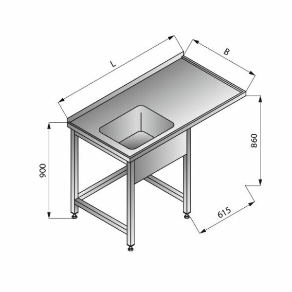 Stoły przystosowane do współpracy ze zmywarkami podblatowymi maja spawana konstrukcje szkieletowa. Płyty górne i blaty stołów oraz płyty zlewozmywakowe wykonywane są z blachy szlifowanej o grubości 1,2 mm wzmocnionej profilami stalowymi. Stoły przystosowane do zestawiania ciągów technologicznych ze zmywarkami kapturowymi maja konstrukcje skręcana, przystosowana do łączenia ich ze sobą oraz ze zmywarkami. Nogi stołów i podstaw wykonane są z zamkniętych pro_ li kwadratowych o wymiarze 40 mm. Stopki o zakresie regulacji 30 mm. Wykonane są z wysokogatunkowego tworzywa. Nadstawki i półki maja spawana konstrukcje ze szkieletem wykonanym z zamkniętych profili kwadratowych o wymiarze 25 mm. Zlewozmywak 500x400x250 mm