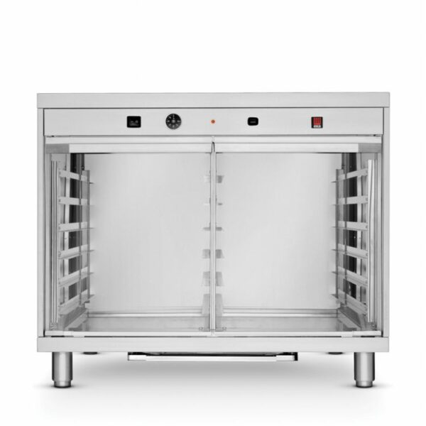 Urządzenie do rozrostu surowego ciasta będące także podstawą pod piec. Modułowy kształt urządzenia pozwala na zestawienie w szeregu większej ilości urządzeń wraz z piecami. Pozwala na oszczędność miejsca oraz prezentację świeżo wypiekanego pieczywa. Ze stali nierdzewnej AISI 430. Prowadnice na blachy cukiernicze 600x400 mm. Przeszklone drzwi skrzydłowe. Temperatura sterowana termostatem, 2 grzałki każda po 1,2 kW. Nawilżanie pośrednie, ręczne za pomocą przycisku - wymagane podłączenie do wody.